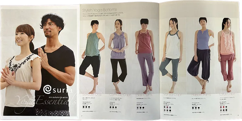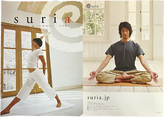 アメリカで先行していたヨガブームが日本にも伝播。当時扱っていたインポートヨガウェアブランドへの問い合わせが増えるも当時の日本ではまだヨガショップはほとんどなく、いち早くヨガウェア・グッズ専門のセレクトショップとして「オンラインショップ suria」を立ち上げ。